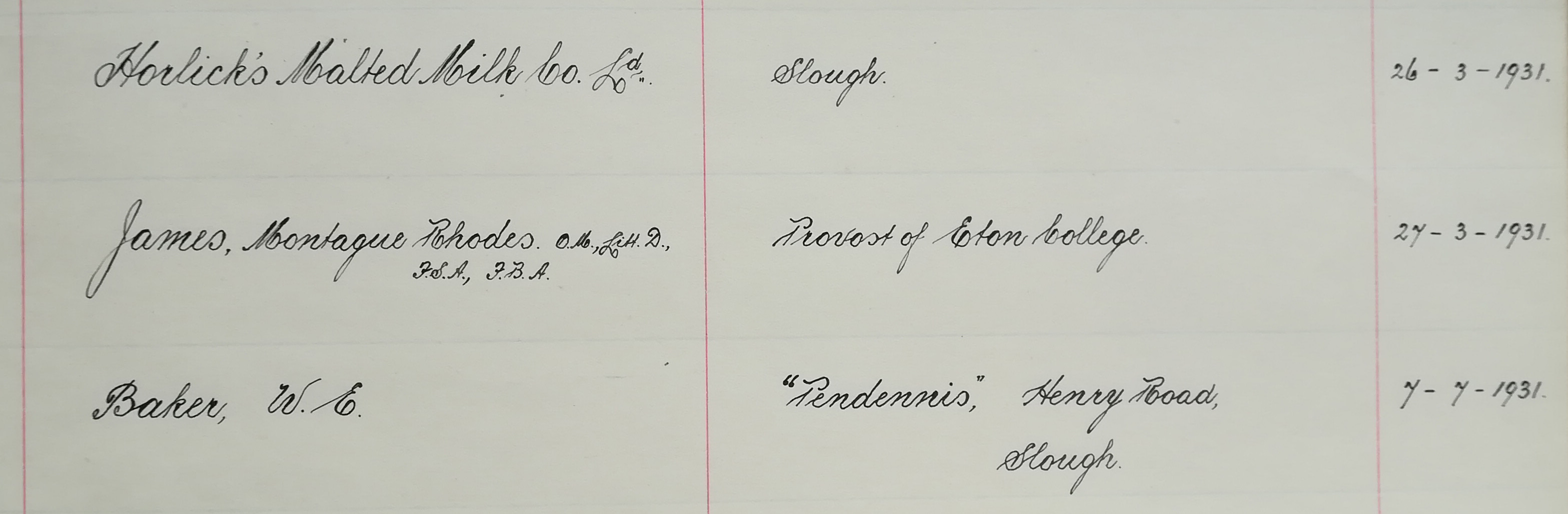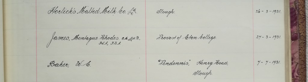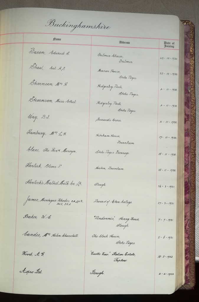 From this research, I have established that the story of the Penn-Gray Society began with its founding in 1930, at which time notices were published stating the aim of raising the sum of £30,000 in order to purchase the land surrounding the ancient churchyard of Stoke Poges for the purpose of preservation and the prevention of the area becoming a site for housing. The membership book reveals that M. R. James became a member (and presumably assumed the role of president) on the 27th March 1931, his name appearing directly below an entry for the Horlicks Malted Milk Co. Ltd., of Slough. That said, a newspaper clipping from The Times dated 28th July 1930 does refer to James as president of the society, and so there is some confusion around the exact dates [8].