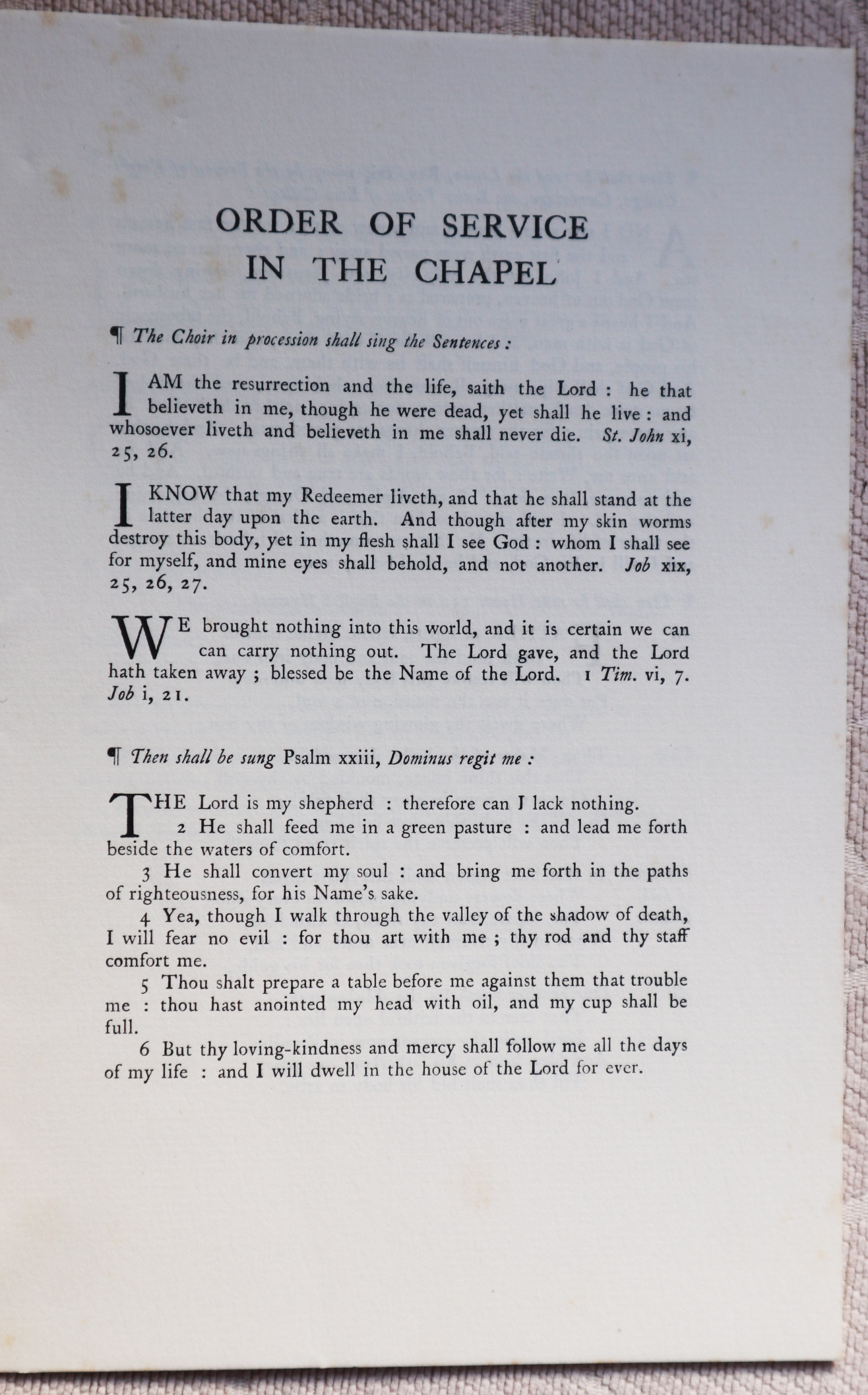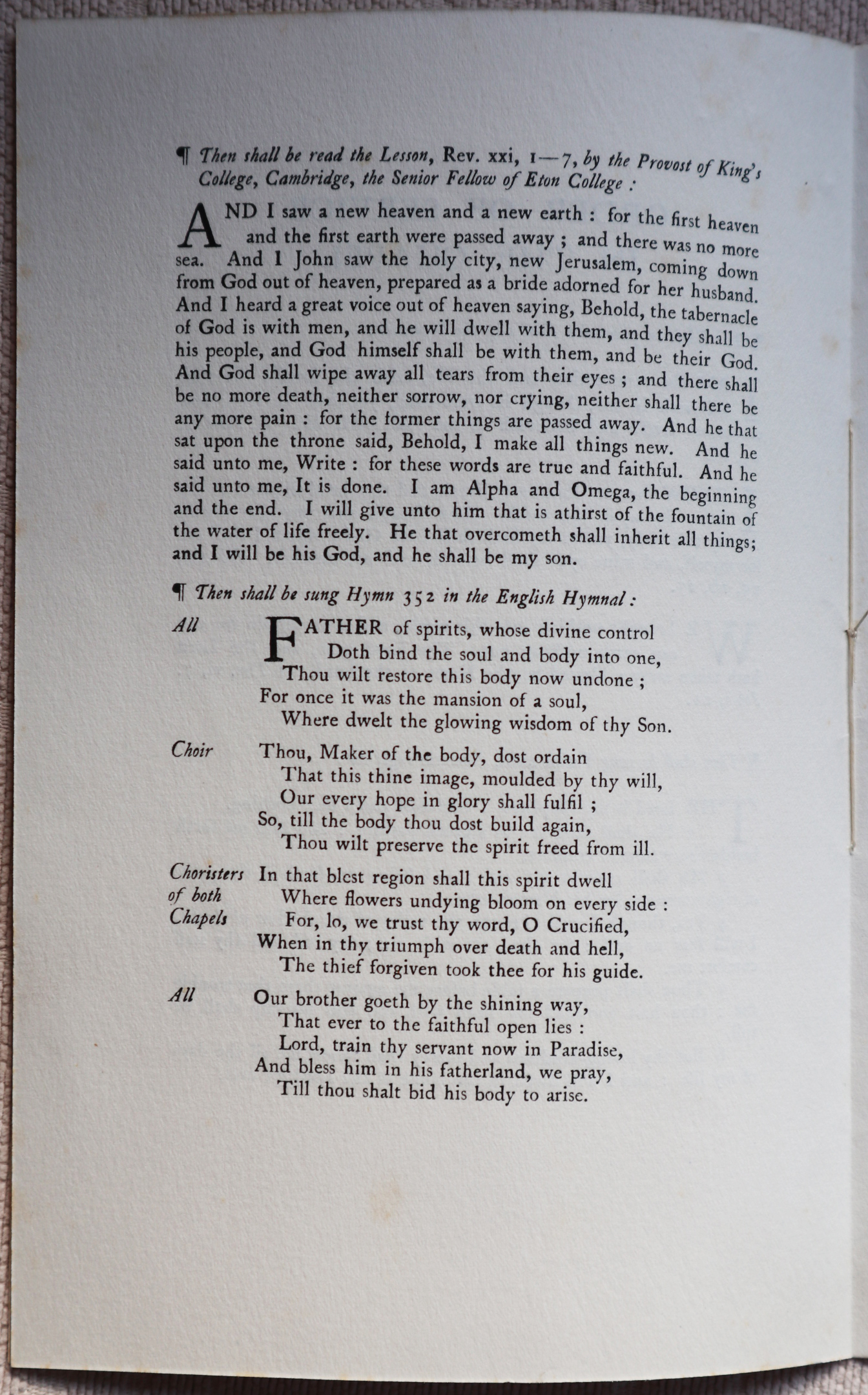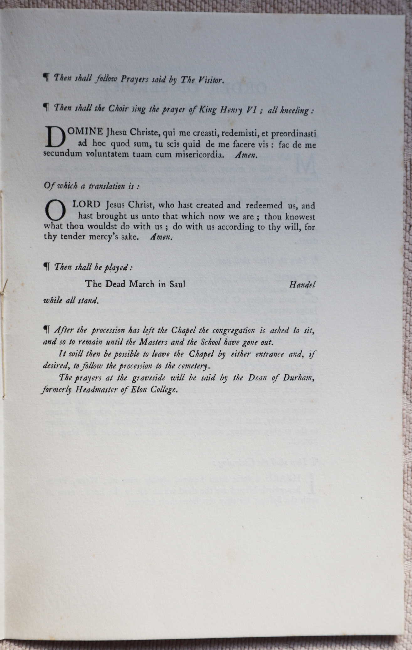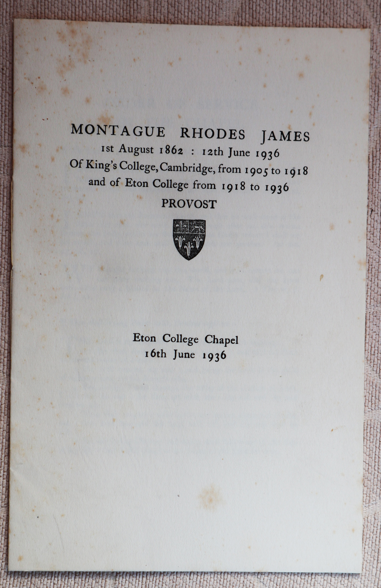 A copy of the order of service for the funeral of Montague Rhodes James, held in Eton College Chapel on 16th June 1936. Reproduced with kind permission of the Stoke Poges Society.
