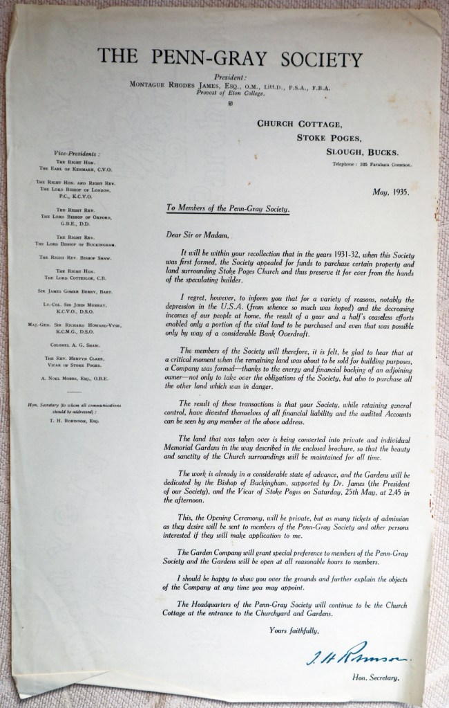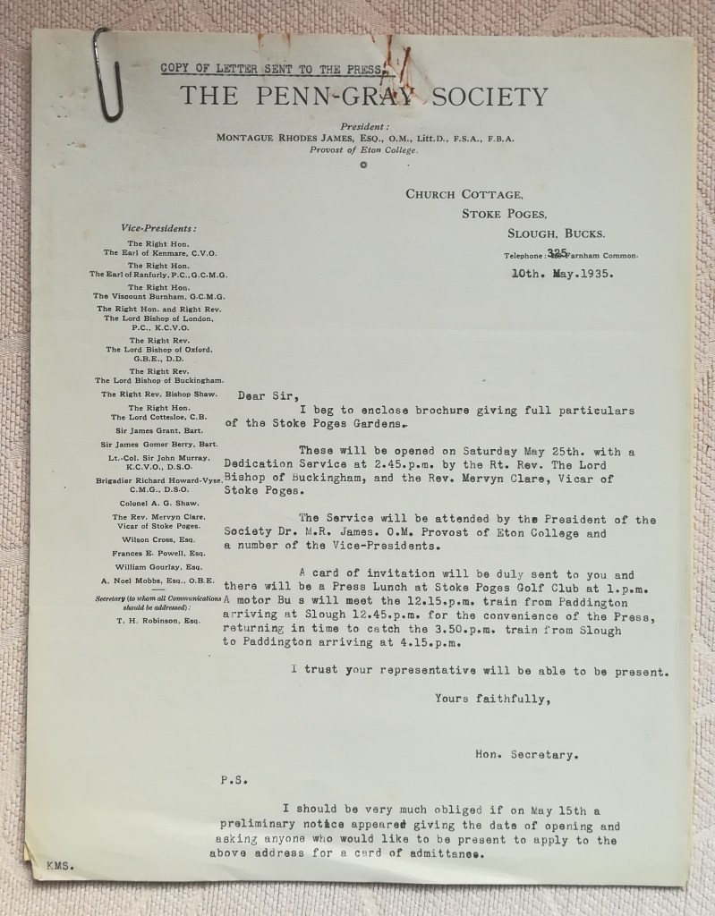 Two letters from the secretary of the Penn-Gray Society, T. H. Robinson, dated May 1935 and sent to the members of the society and the press respectively, announcing the opening of the memorial gardens and dedication ceremony. James in mentioned in each. Reproduced with kind permission of the Stoke Poges Society.