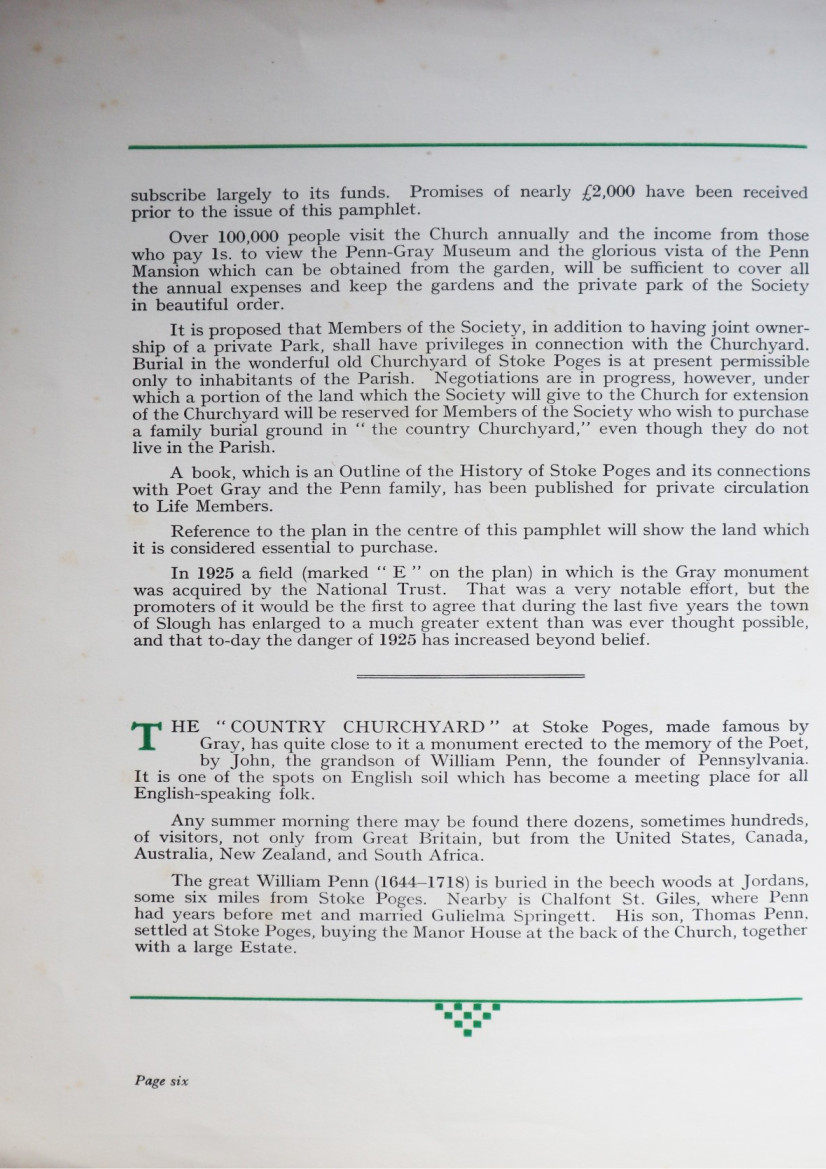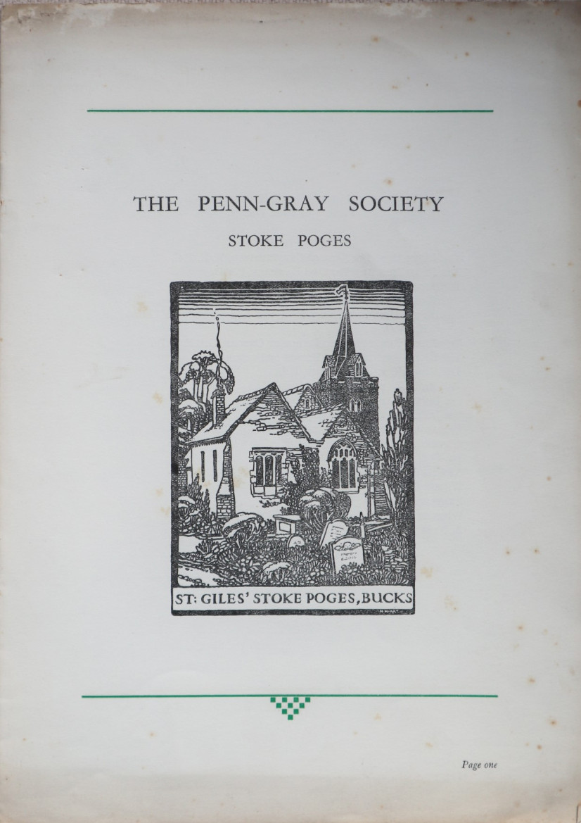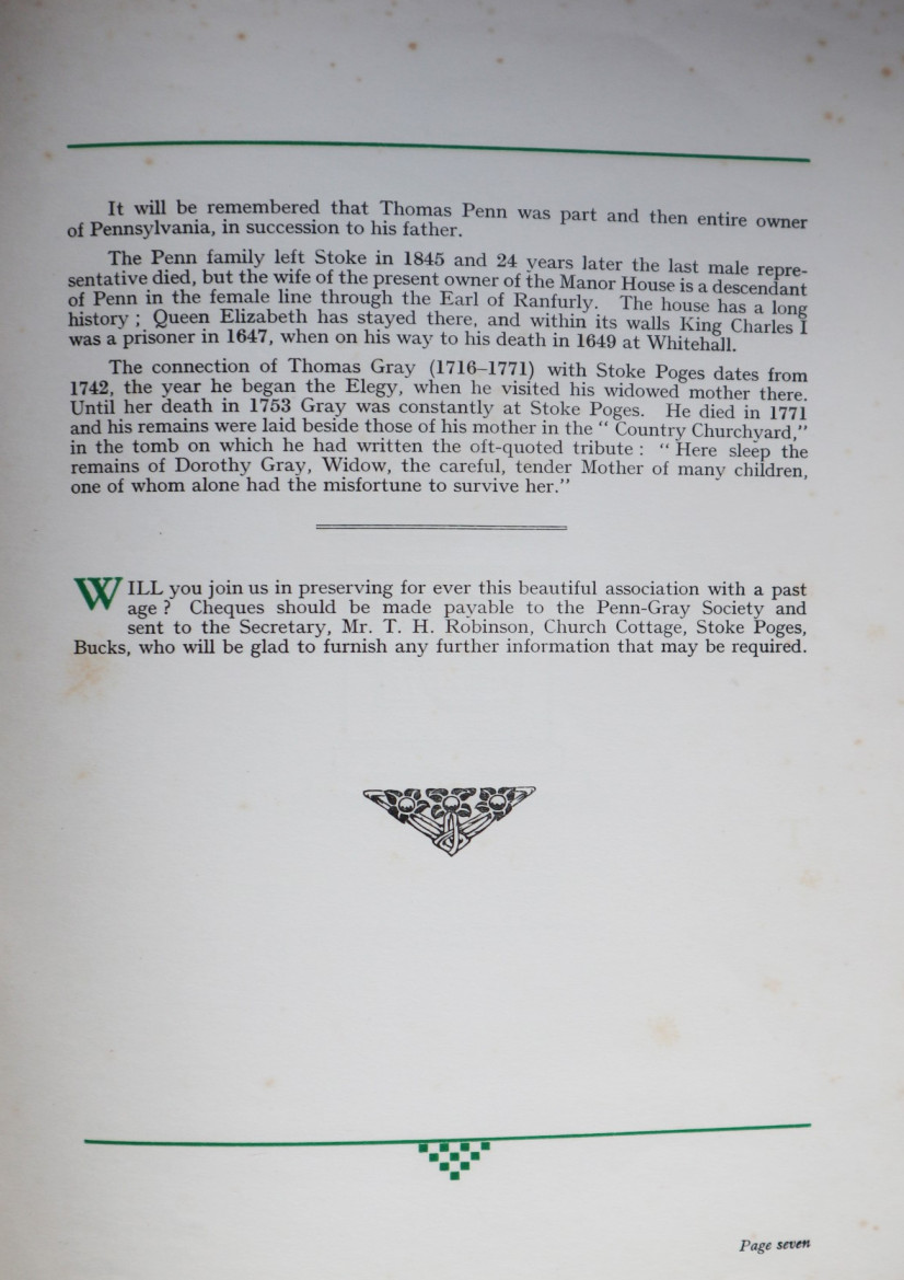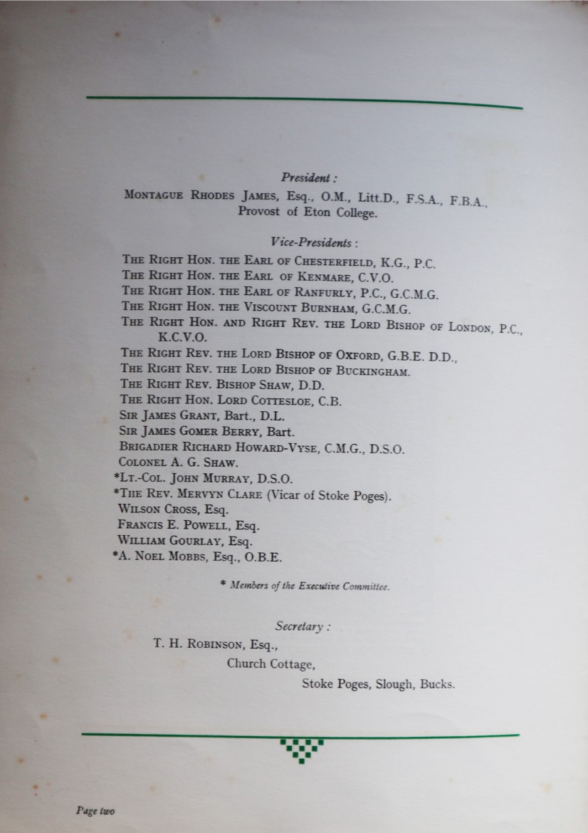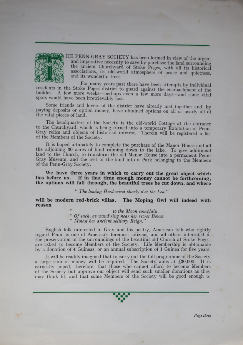The promotional pamphlet published by the Penn-Gray Society to outline the aims of the group and garner support and funding. James is listed as president on page two. Reproduced with kind permission of the Stoke Poges Society.
