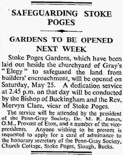 [11] “Safeguarding Stoke Poges – Gardens to be Opened Next Week.” The Times, 15th May 1935, p. 11.