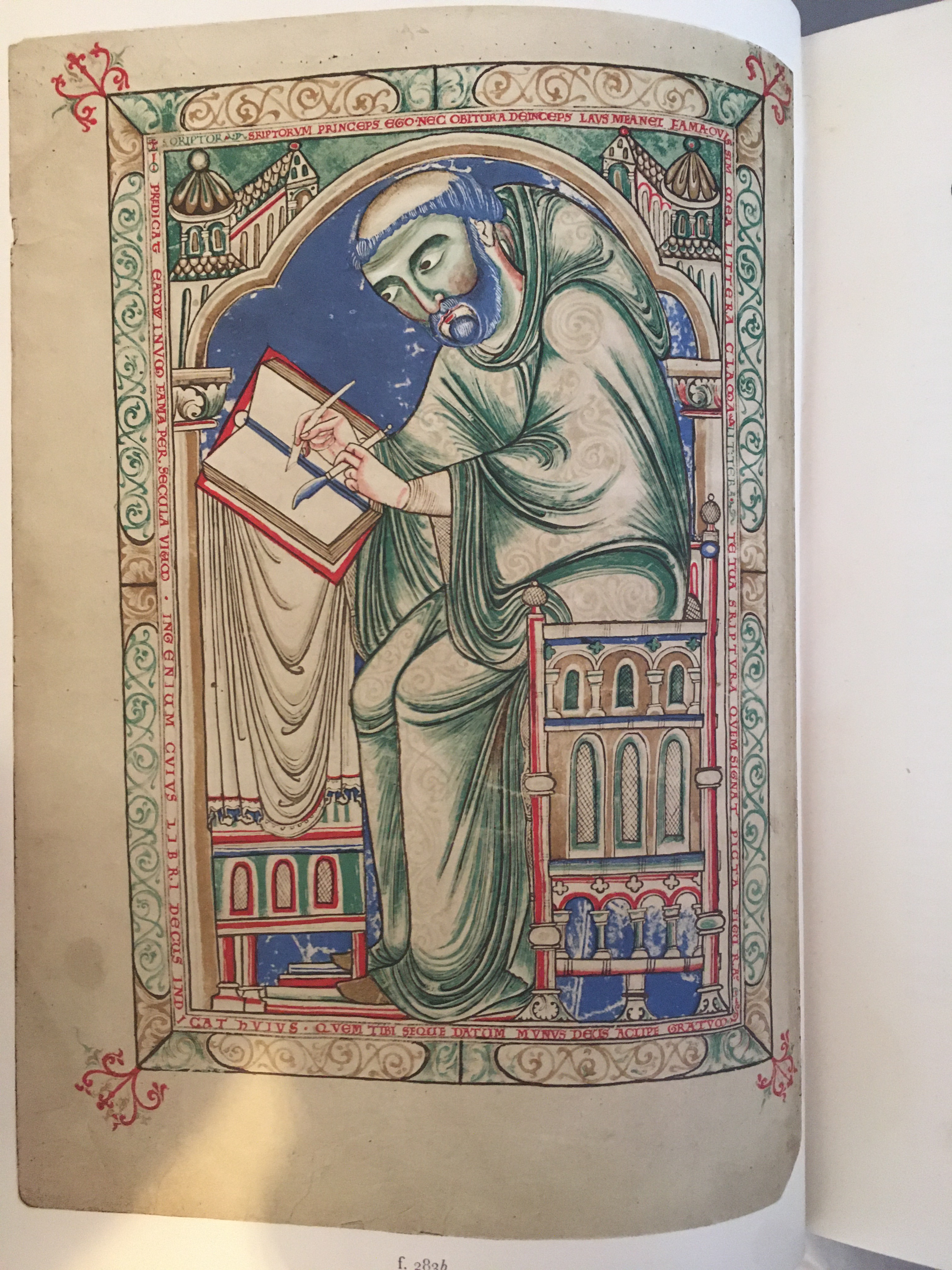 The letter: By its fame your script proclaims you, Eadwine, whom the painted figure represents, alive through the ages, whose genius the beauty of this book demonstrates. Receive, O god, the book and its donor as an acceptable gift.”