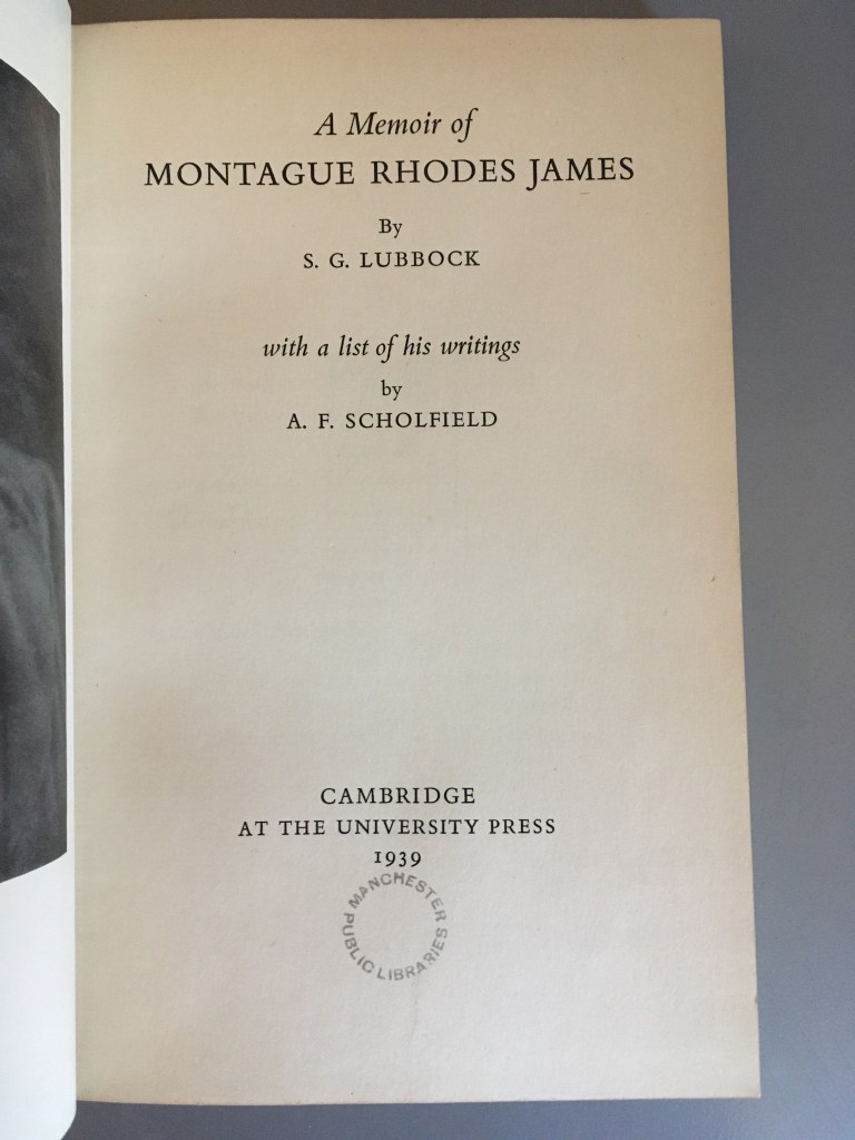 Memoir published three years after James’ death. Lubbock was educated at Eton College and King’s, and assistant master at Eton, 1897-1934. Contains a bibliography compiled by A. F. Scholfield, Cambridge University Librarian, 1923-1949.