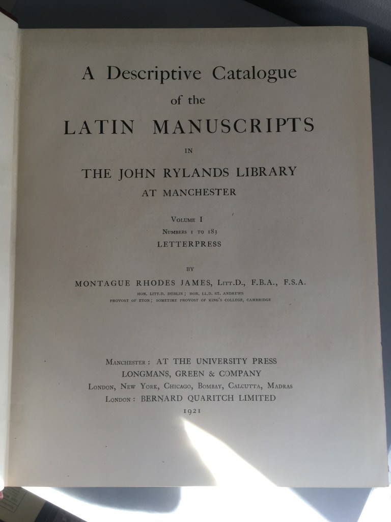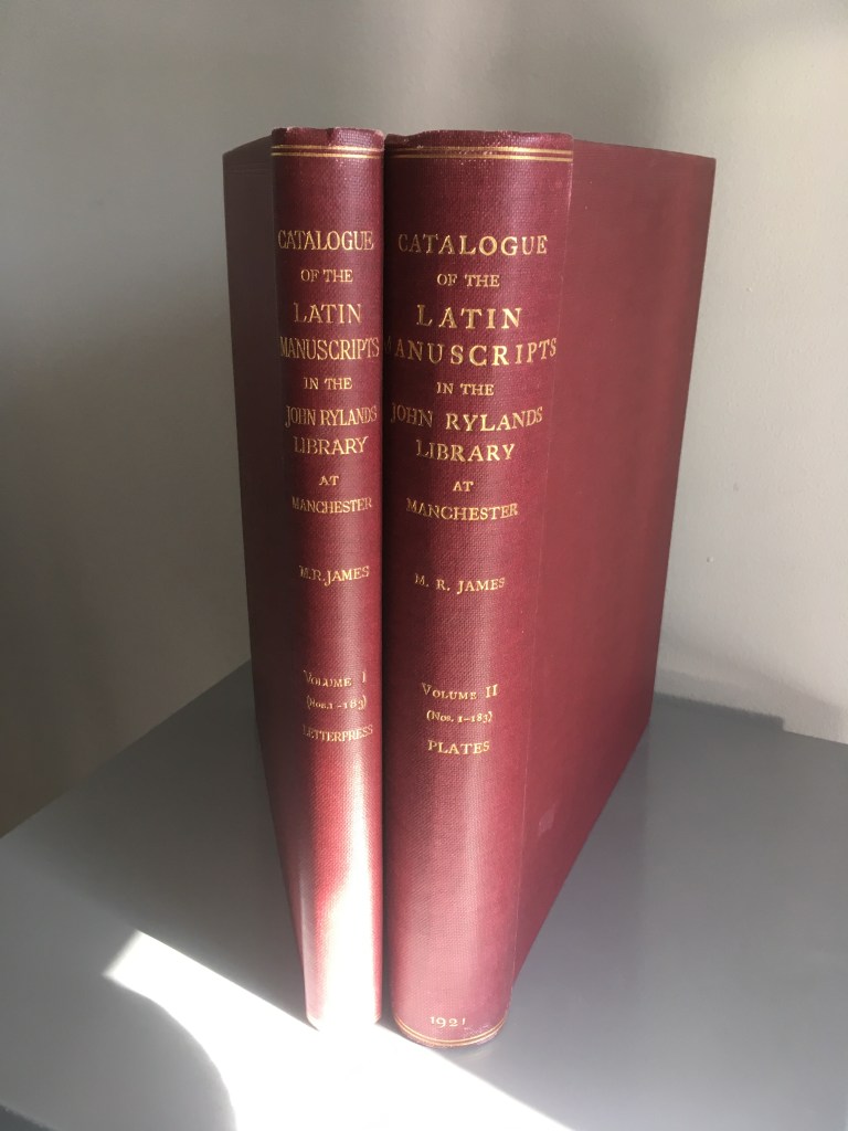 A Descriptive Catalogue of the Latin Manuscripts in the John Rylands Library at Manchester (two volumes; Manchester University Press, 1921) Catalogue of Mss. Huge two-volume set; Volume I containing the text catalogue, and Volume II containing plates of the Mss. A Descriptive Catalogue of the Latin Manuscripts in the John Rylands Library at ManchesterVolume I title pageVolume II title pagePlate 24 Share this: Click to share on X (Opens in new window) X Click to share on Facebook (Opens in new window) Facebook