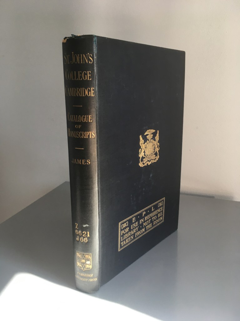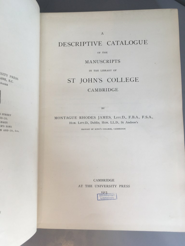 A Descriptive Catalogue of the Manuscripts in the Library of St. John’s College, Cambridge (Cambridge University Press, 1913) Catalogue of Mss., originally in the collection of Edinburgh Public Library. “Not to be taken from the room”… Oh dear. A Descriptive Catalogue of the Manuscripts in the Library of St. John’s College, CambridgeFront coverTitle page Share this: Click to share on X (Opens in new window) X Click to share on Facebook (Opens in new window) Facebook