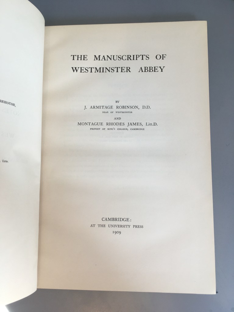 The Manuscripts of Westminster Abbey, with J. A. Robinson (Cambridge University Press, 1909) Catalogue of Mss., written with J. Armitage Robinson, Dean of Westminster. The Manuscripts of Westminster AbbeyFront coverTitle page Share this: Click to share on X (Opens in new window) X Click to share on Facebook (Opens in new window) Facebook
