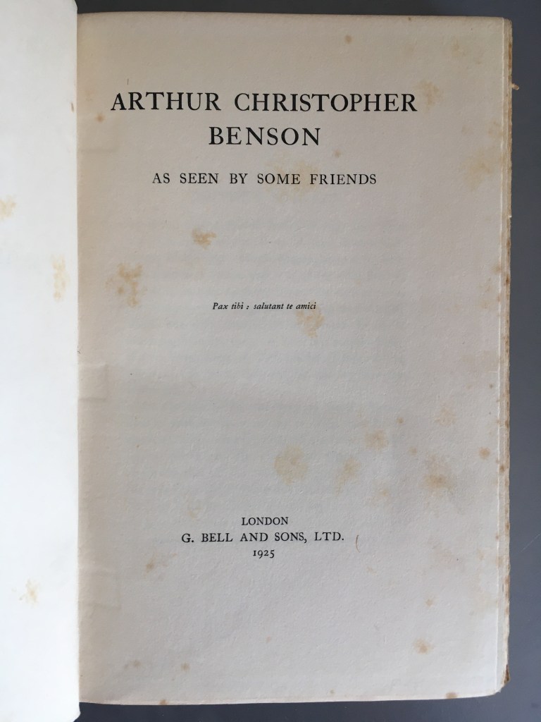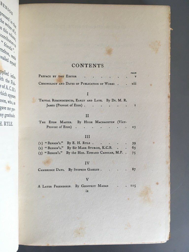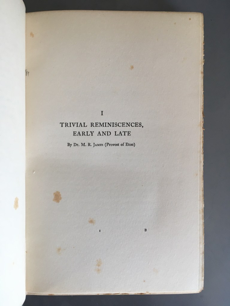 This collection of tributes to M. R. James’ long-time friend (and private critic) A. C. Benson was published shortly after his death, and opens with a 21-page contribution by James entitled “Trivial Reminiscences, Early and Late”.