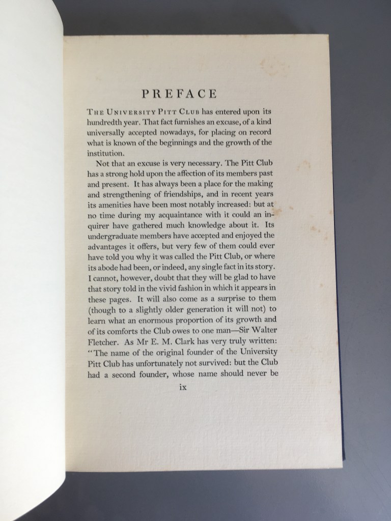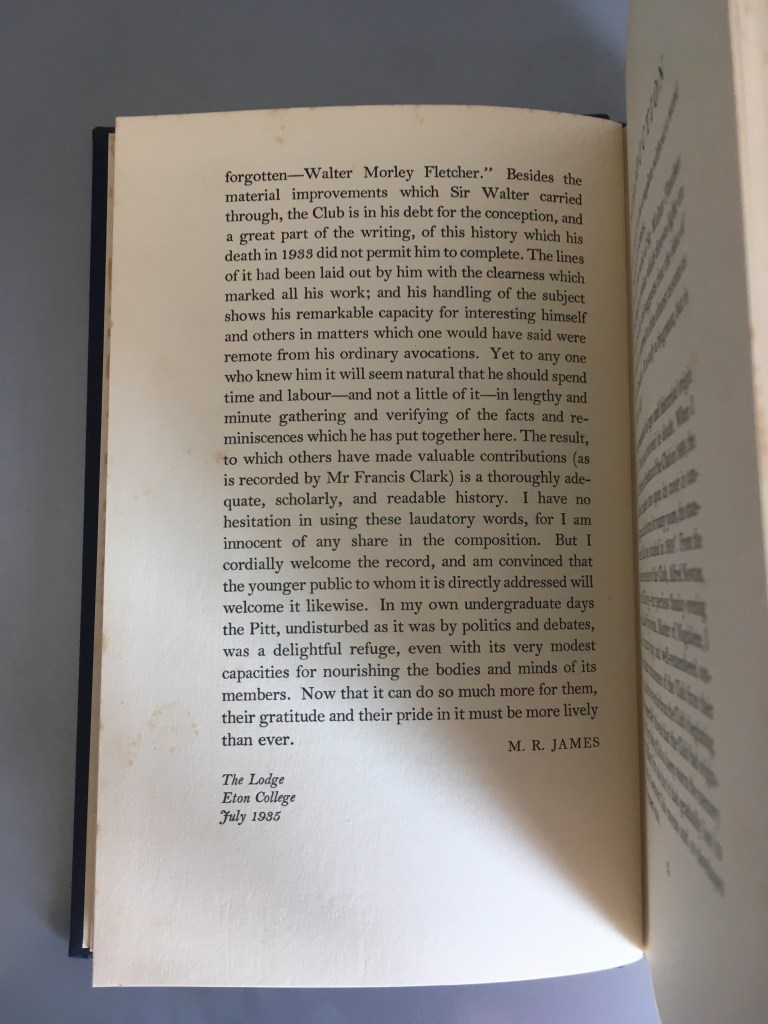 James provided the preface (pictured below) to W. M. Fletcher’s account of the history of Cambridge University’s private members club, the Pitt Club, in 1935. Fun fact: as those familiar with Cambridge may know, the ground floor of the Pitt Club’s headquarters is currently home to the most oddly grandiose branch of Pizza Express you will ever set foot in.