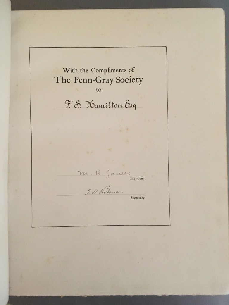 This book is somewhat of an oddity in the collection, and while neither written by nor about James (save for his name appearing in print as president of the Penn-Gray Society on page 42), does contain his signature on a compliments page at the front. As such, I was extremely happy to add this particular volume to the collection.