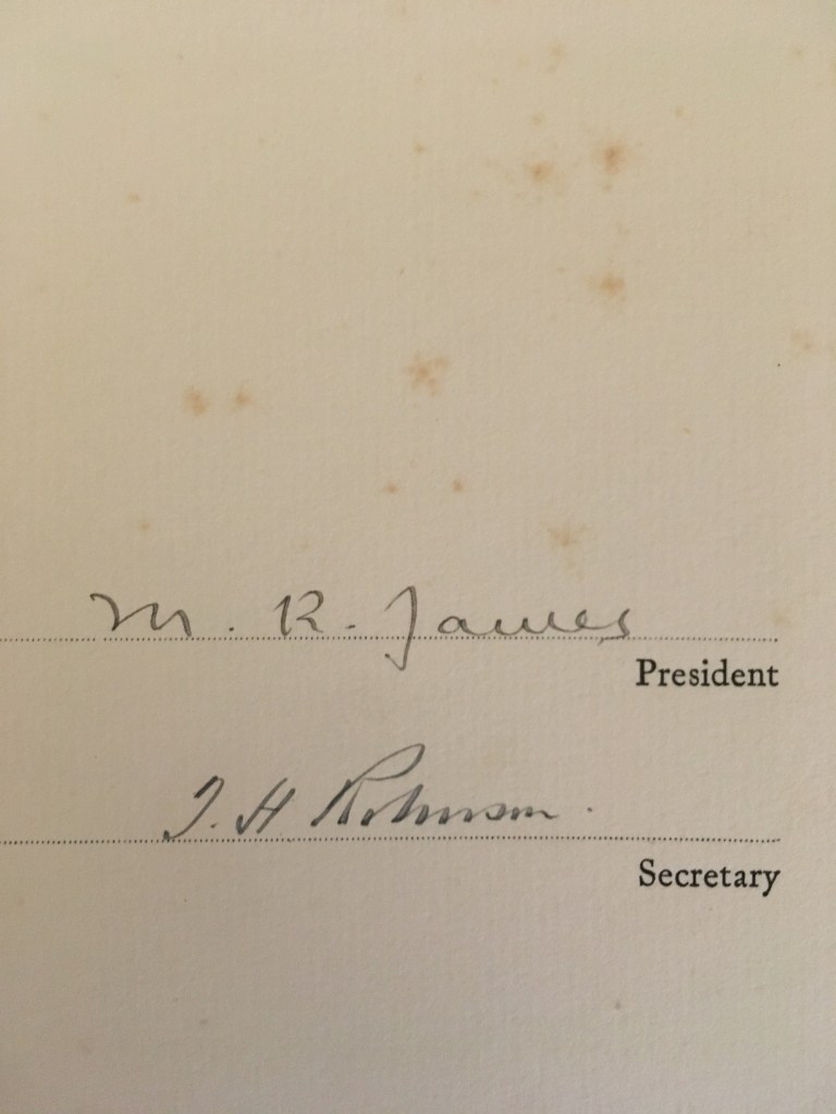 Compliments page signed by M. R. James