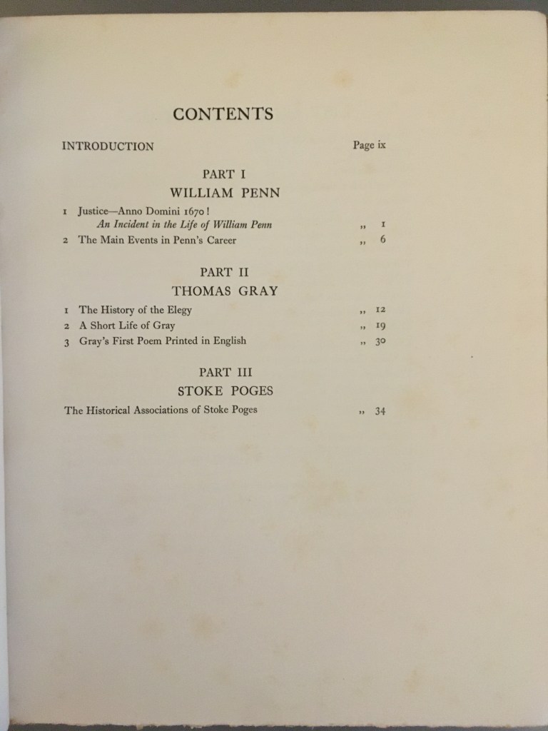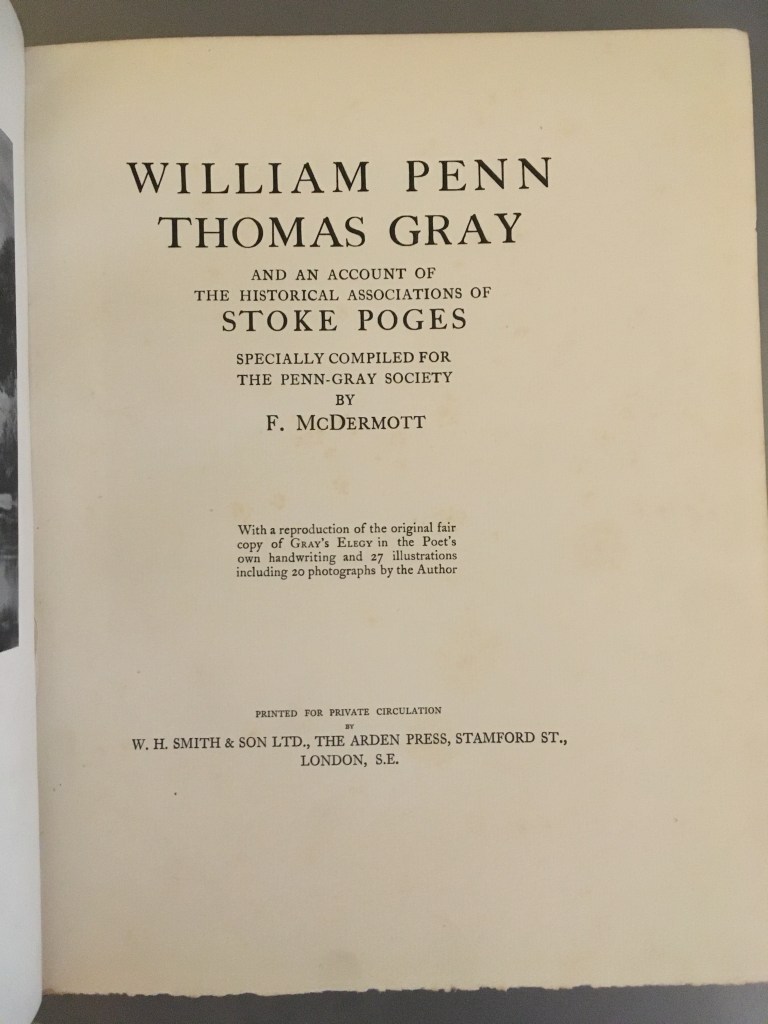 William Penn, Thomas Gray and an Account of the Historical Associations of Stoke Poges, specially compiled for the Penn-Gray Society by F. McDermott (printed for private circulation by W. H. Smith & Son Ltd., 1930; signed by M. R. James)