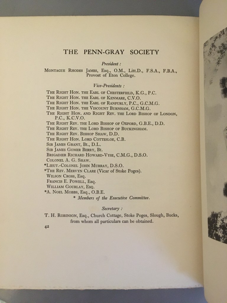 The discovery of this book spurred me on to engage in some research around James’ connection to Stoke Poges and the Penn-Gray Society, the full detail of which you can read in this blog article.